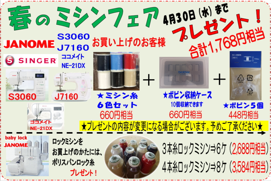 【終了しました】「春のミシンフェア」2/15(土)~4/30(水)