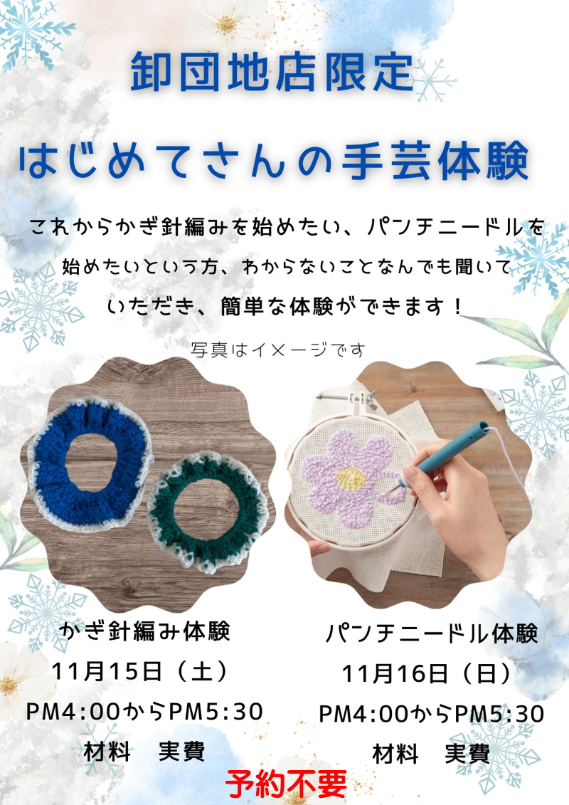 卸団地店「はじめてさんの手芸体験」かぎ針編み11/15(土)パンチニードル11/16(日)