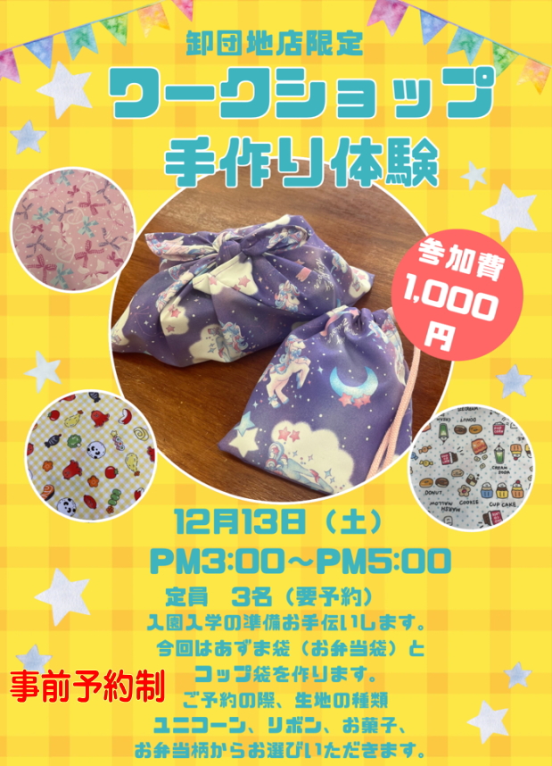 手づくり体験「お弁当袋or巾着袋」ワークショップ12月13日(土)